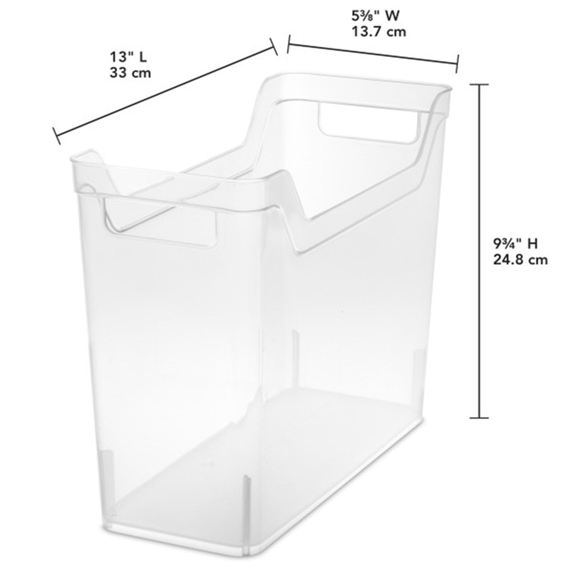 The modern, clear design blends effortlessly with any home decor while providing quick visibility of the contents inside. Organize your home with ease and efficiency using these versatile Shelf Bins, which offer a practical and stylish storage solution. The overall outside dimensions are 13 inches long, 5.4 inches wide, and 9.75 inches tall, making them the ideal addition to your home organization system.