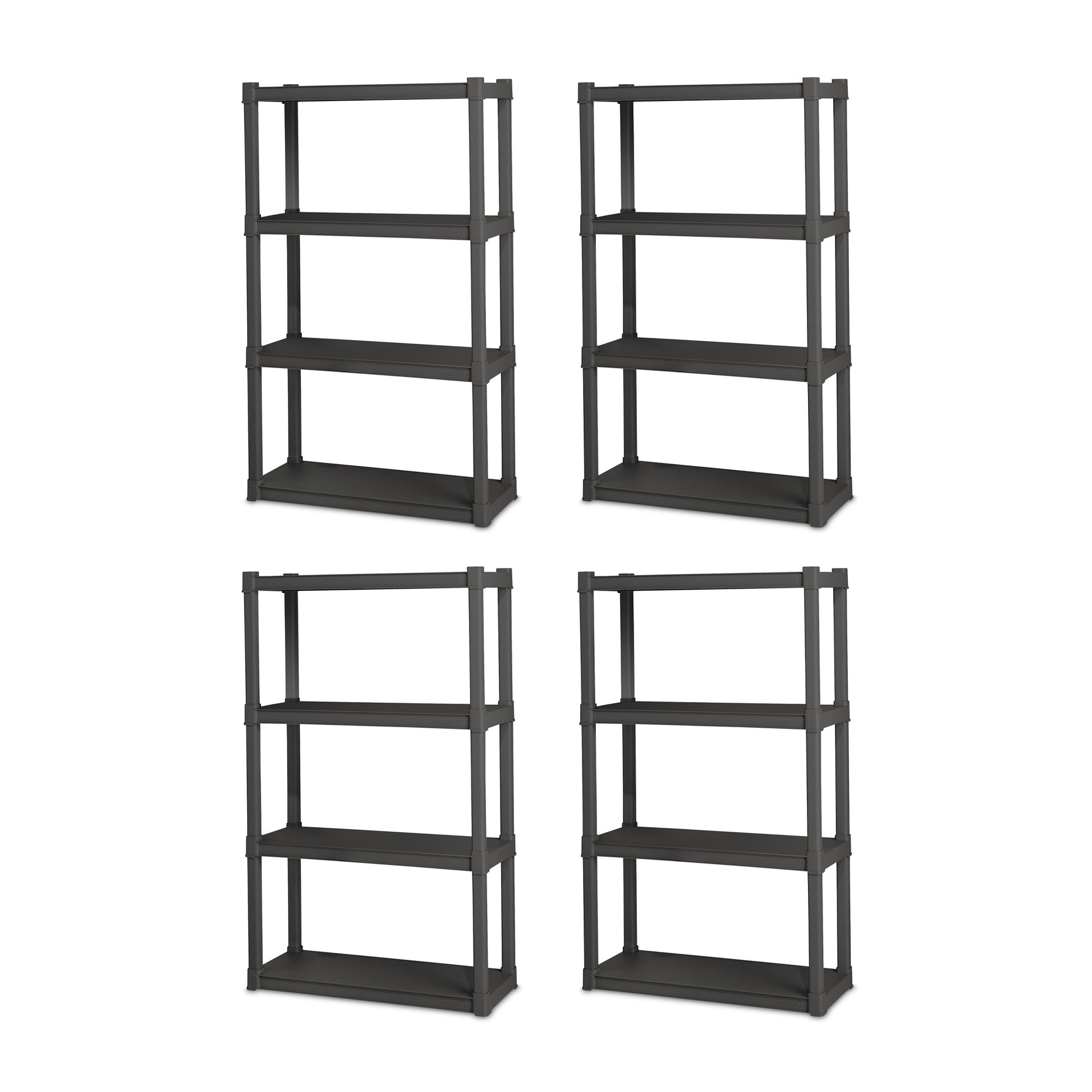 Get your garage, playroom, laundry room, or closet organized with this pack of 4 Sterilite Plastic Indoor Outdoor 4 Shelf Durable Shelving Unit.