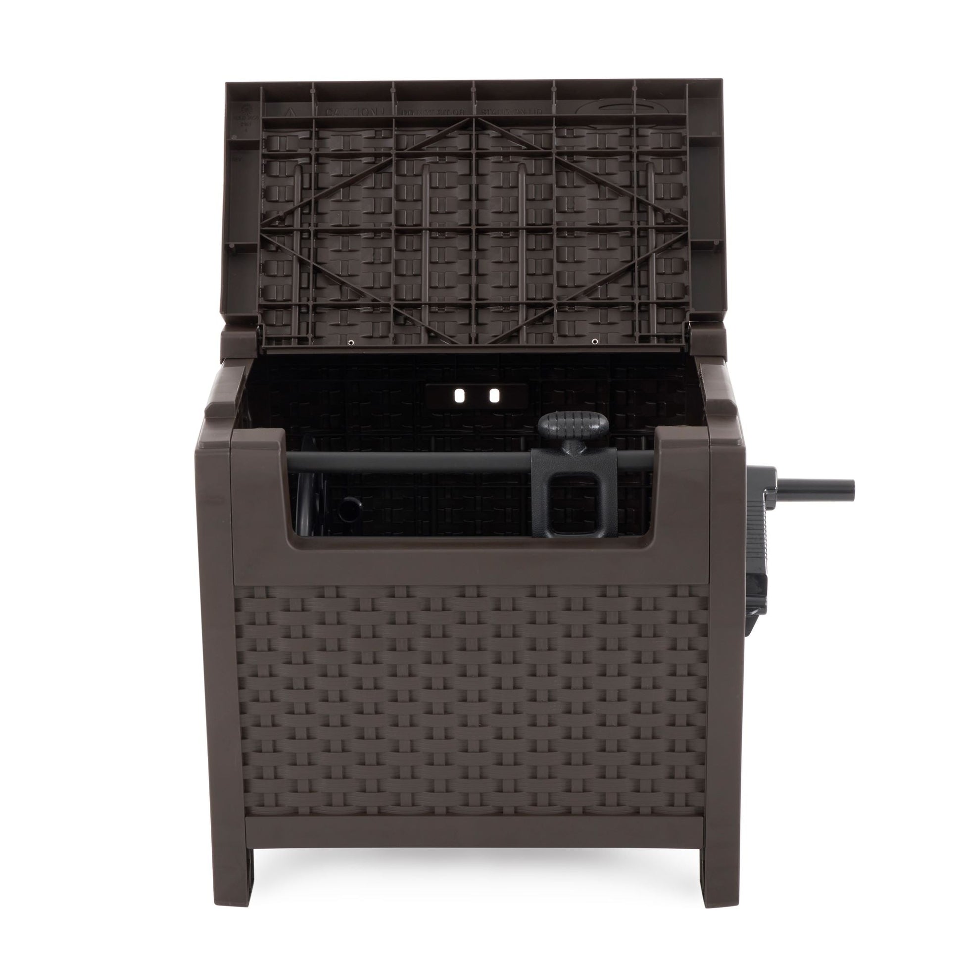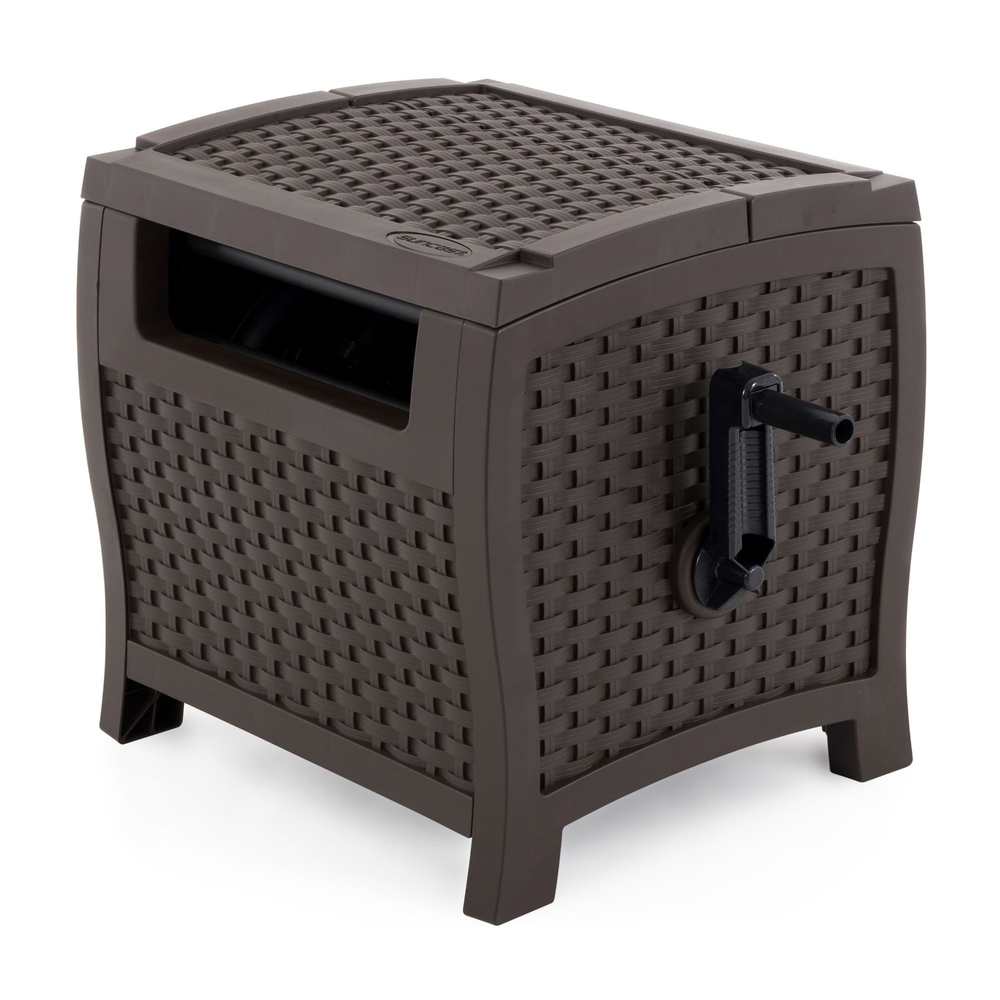 Find a simple solution when it comes to using the hose to water your yard, grade, or even while you wash your car with these winding, unwinding hose storage buckets. Bypass the mess and keep your water hose organized while being stored out of the side with these stylish hideaways. Built with sturdy, high-quality resin materials, these storage hideaway containers are ensured to hold up against unwanted outdoor elements. Being able to hold a 175-feet of 5/8-inch standard vinyl hose capacity, you'll be able to reach all around your hose easier with a longer hose. Easily unwind to extend the hose or rewind it up with the side handle for easy usage.