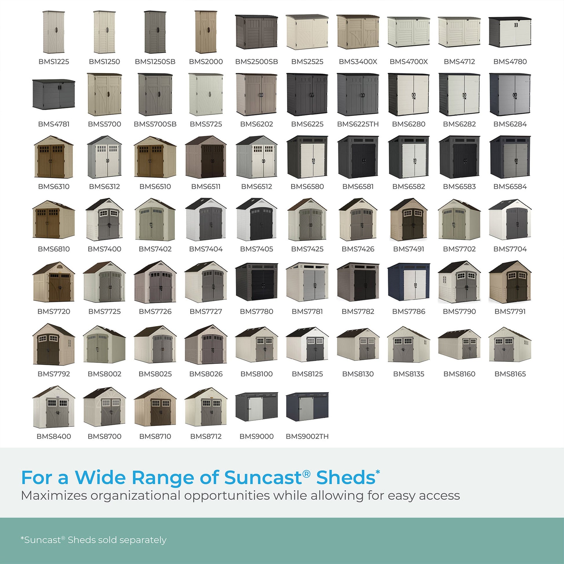 Whether you need a place to store your gardening tools, lawnmowers, snow blowers, sports equipment, or DIY supplies. This simple and effective accessory unlocks countless organizational opportunities in your Suncast shed.