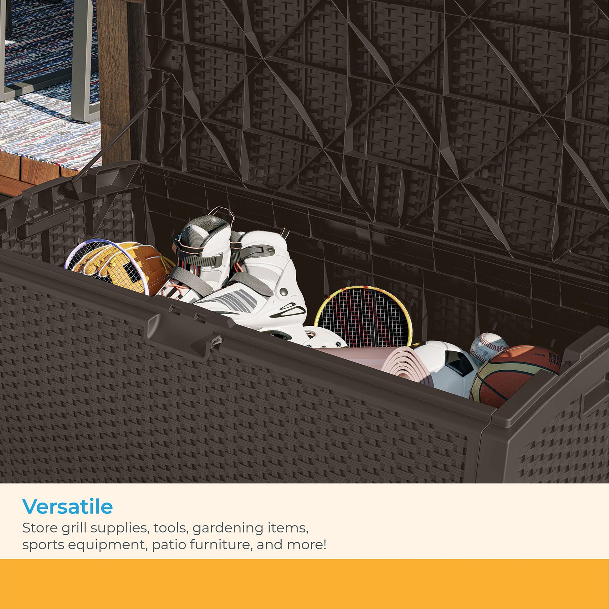 Store your gardening tools, athletic equipment, and outdoor dining décor in style with this Suncast Wicker Deck Box. The Suncast 99-gallon patio deck box is ideal for storing patio accessories. Its durable construction is matched with contemporary design to bring style and harmony to any outdoor seating.