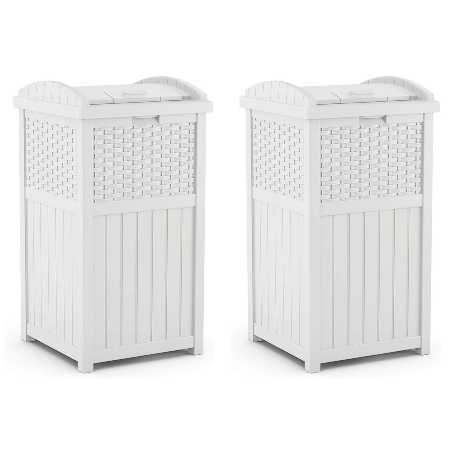 Suncast Wicker Resin Outdoor Hideaway Trash Can Bin with Latching Lid (2 Pack)