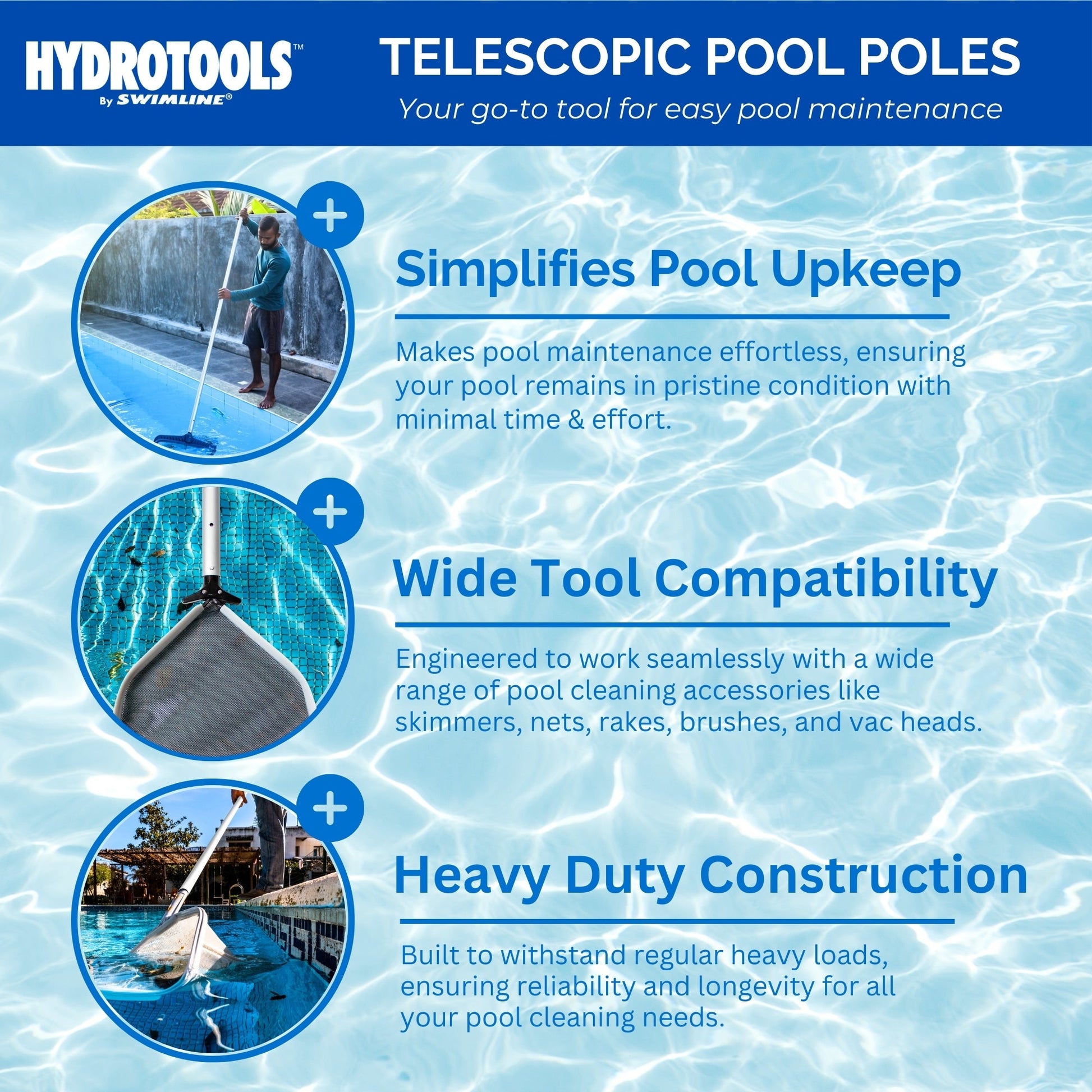 - High-quality 3 piece universal swimming pool telescopic pole designed to make cleaning your pool an easier chore