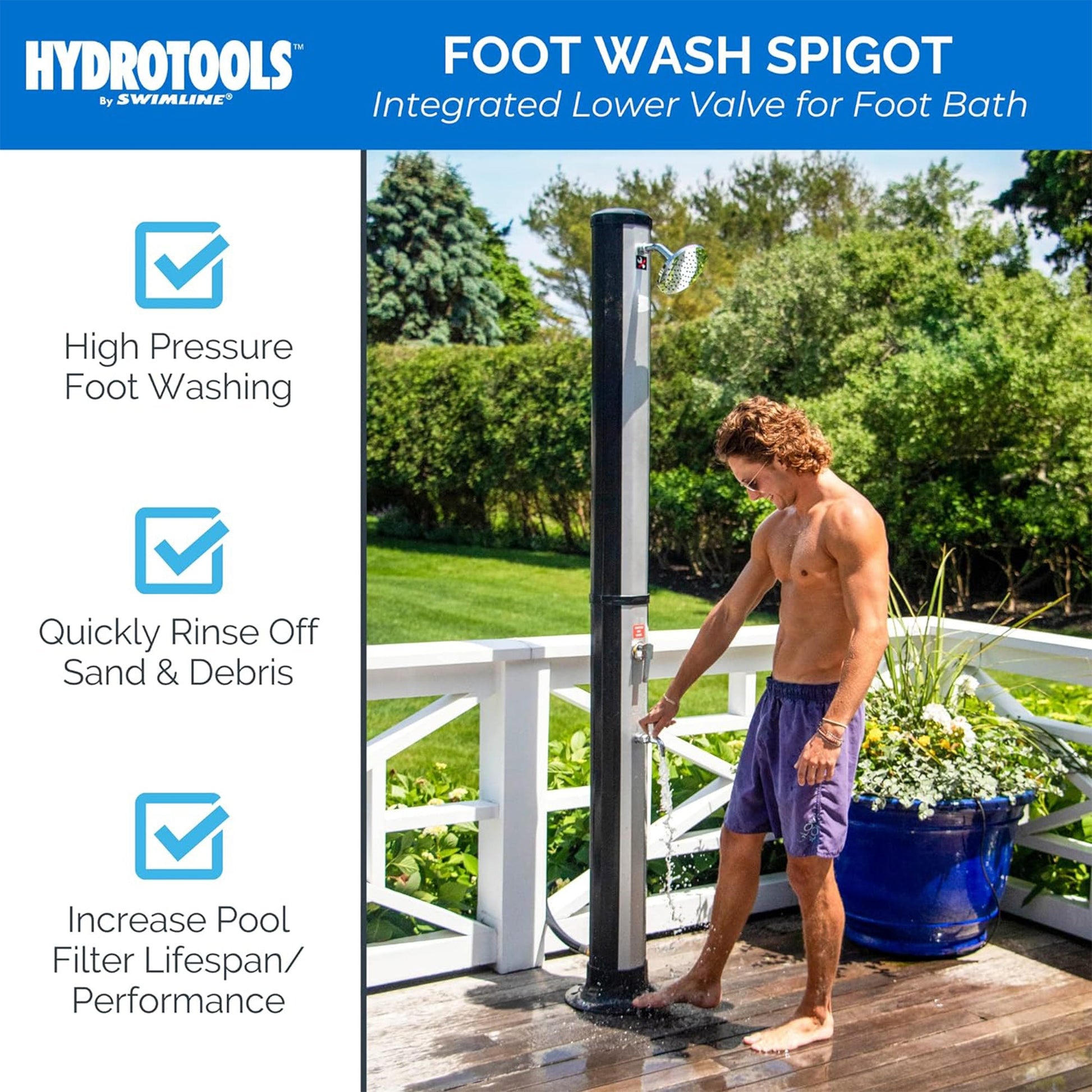 - Solar-powered shower eliminates the need for electricity and provides ecologically heated water ideal for rinsing and cleaning after pool or spa days