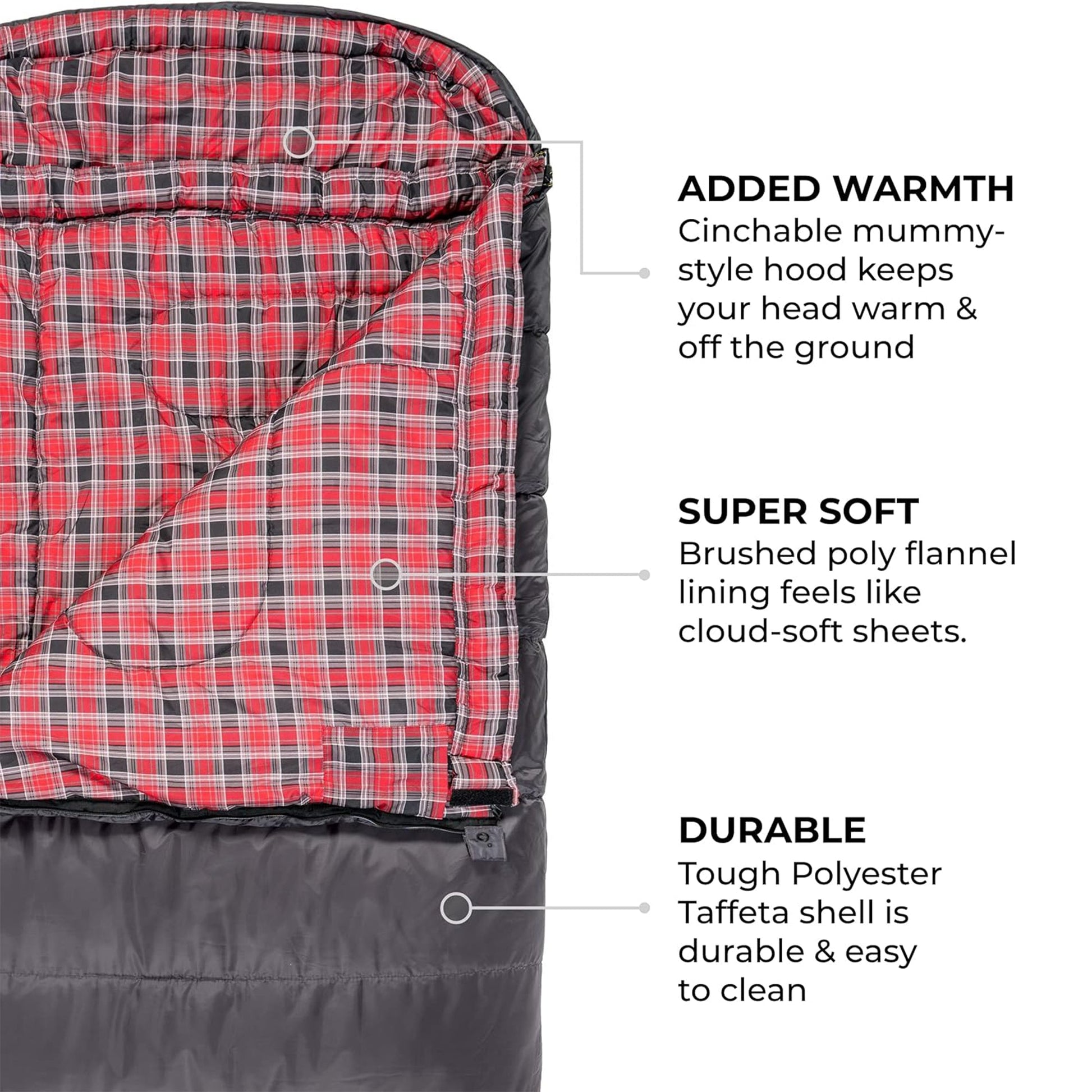 - Sleeping bag that lets you experience the luxury of a soft poly-flannel lining that ensures a cozy night's sleep, making every camping trip a relaxing retreat