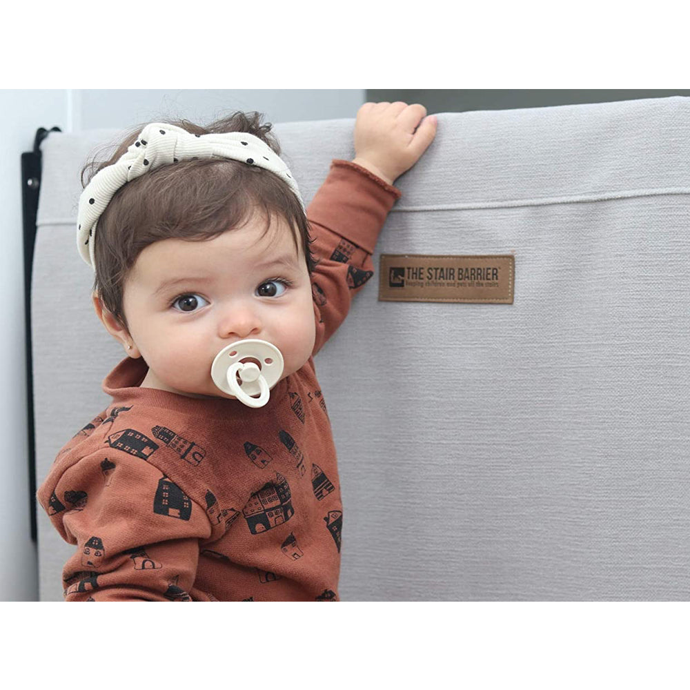 Introducing THE STAIR BARRIER Wall to Wall Fabric Baby Pet Gate offers parents a safe and attractive solution for making stairs off-limits to children and pets. This kit includes 1 Stair Barrier Slipcover and 1 Cardinal Gates SS30 Model Swing Gate with Hardware.