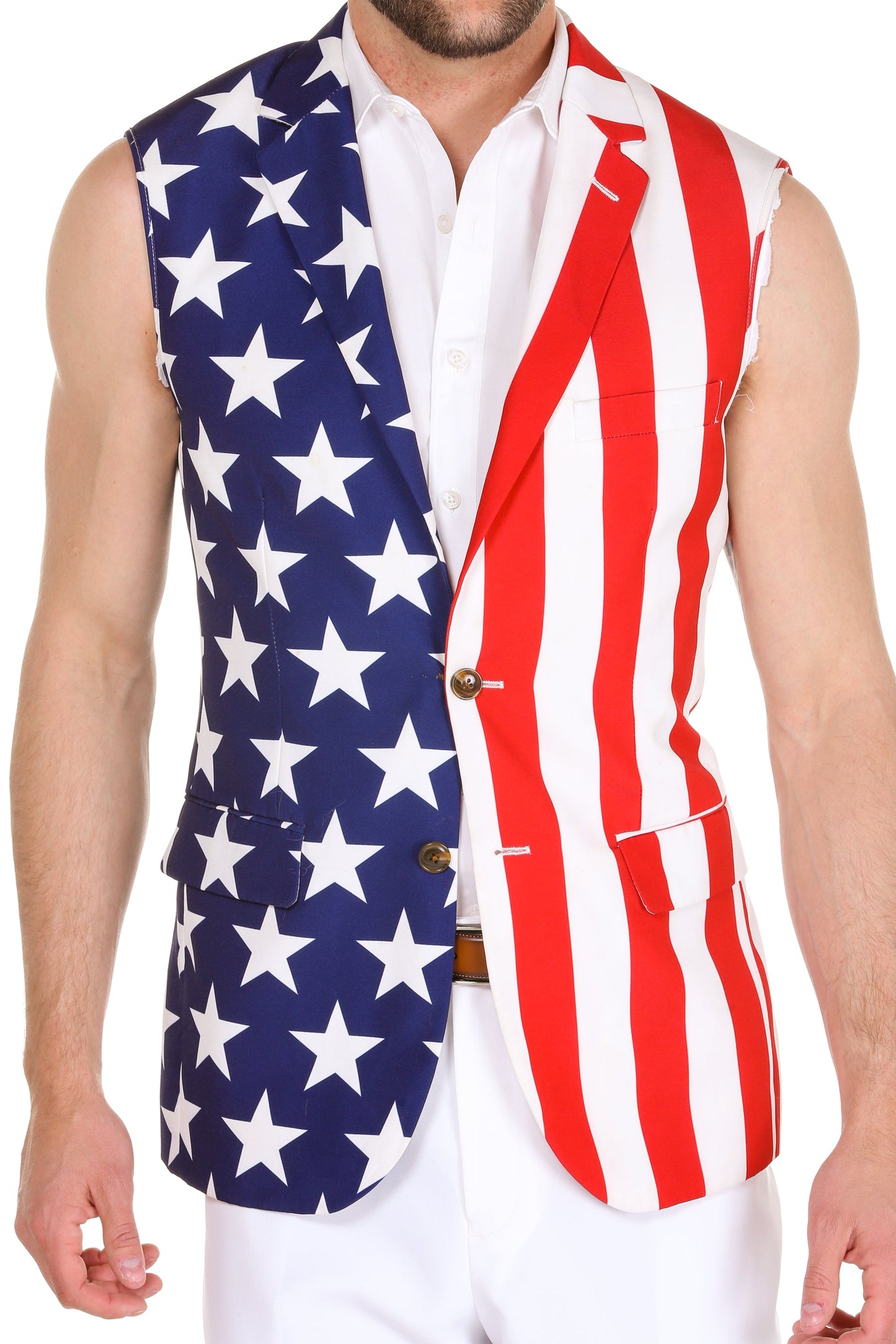 So you think you can handle a red, white, and blue striped USA sleeveless blazer? You thoroughly believe you can tame the authority of this American flag sleeveless jacket? If you’re already questioning yourself, look elsewhere. If you’ve never shot a Whisker Biscuit out of your bunghole, you can’t handle this. Don’t know what a Honkey Lighter is? You may not be fit for this USA blazer. If you’ve never felt the G-force of a Whistling’ Bunghole leave the very palm from which you feed yourself from, you cannot harness the power of this sleeveless blazer.
