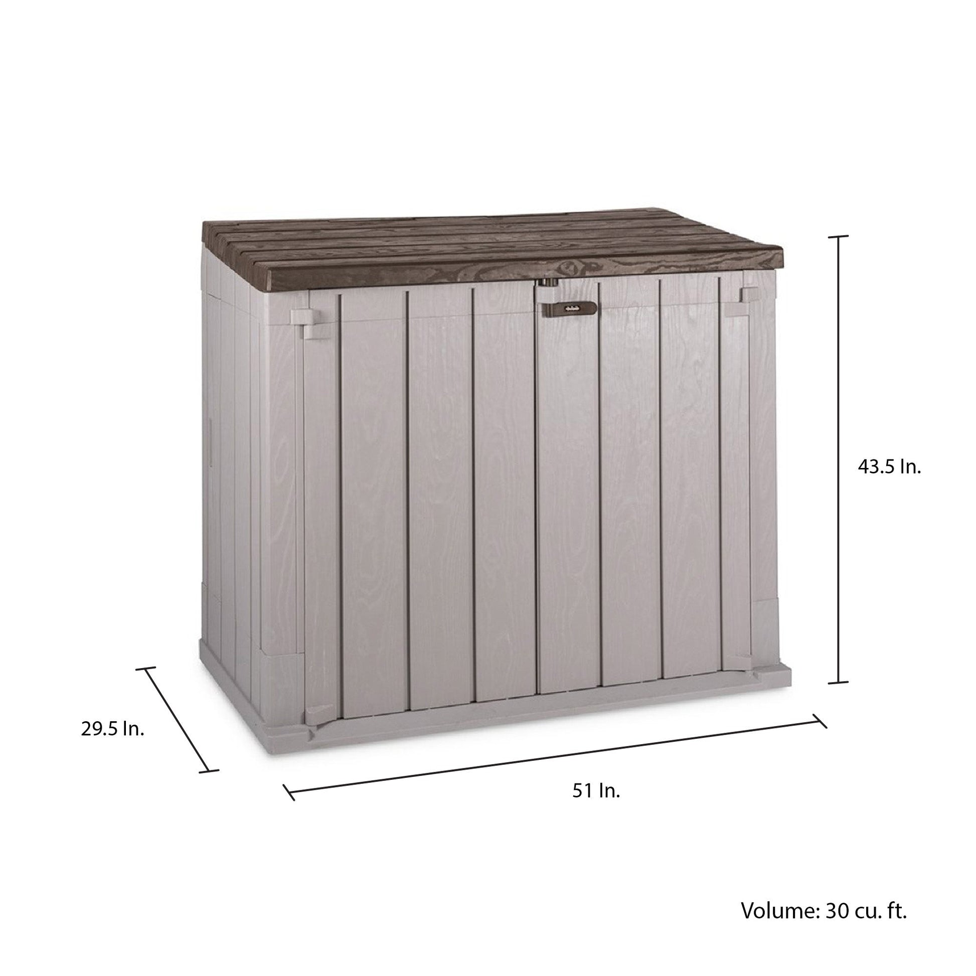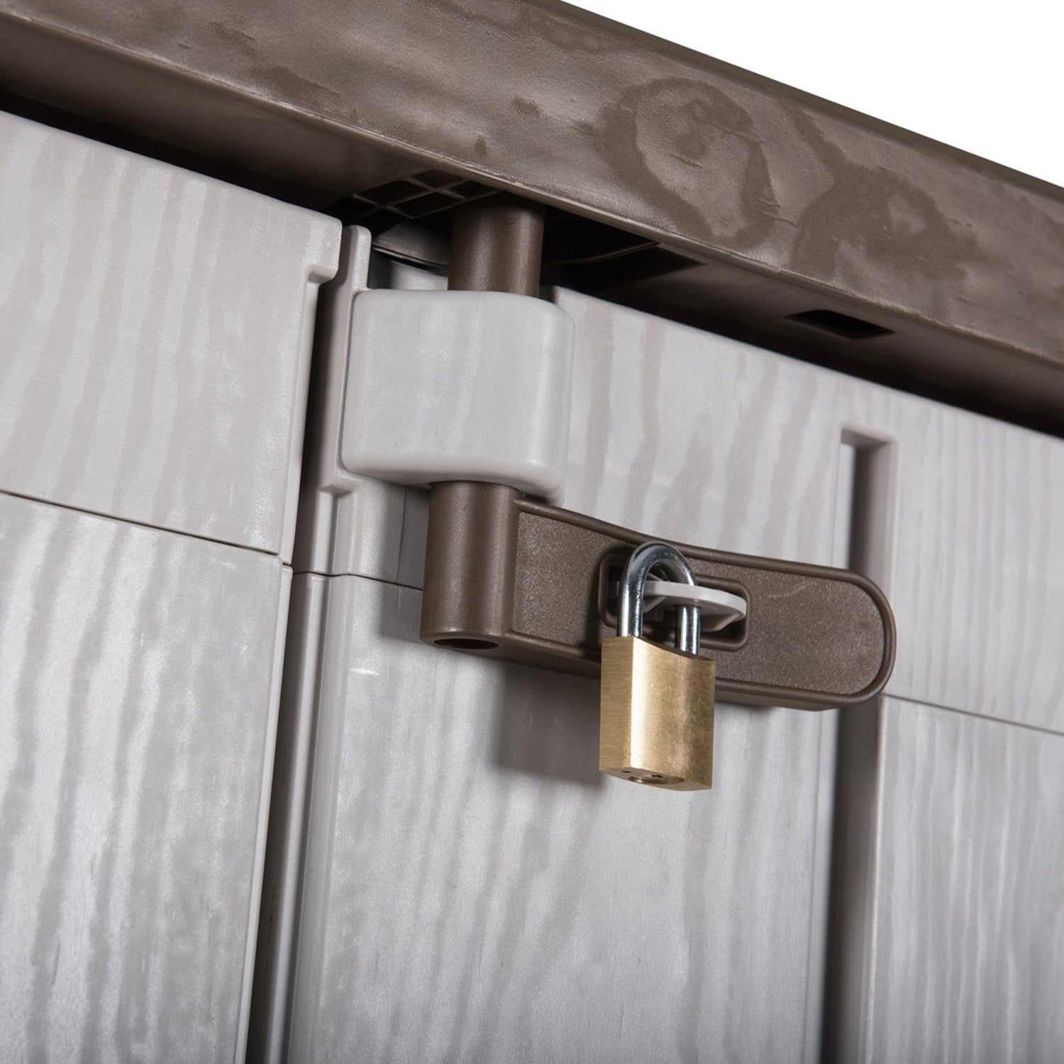 - Weatherproof outdoor storage unit that blends the durability of plastic construction with the look and texture of natural wood