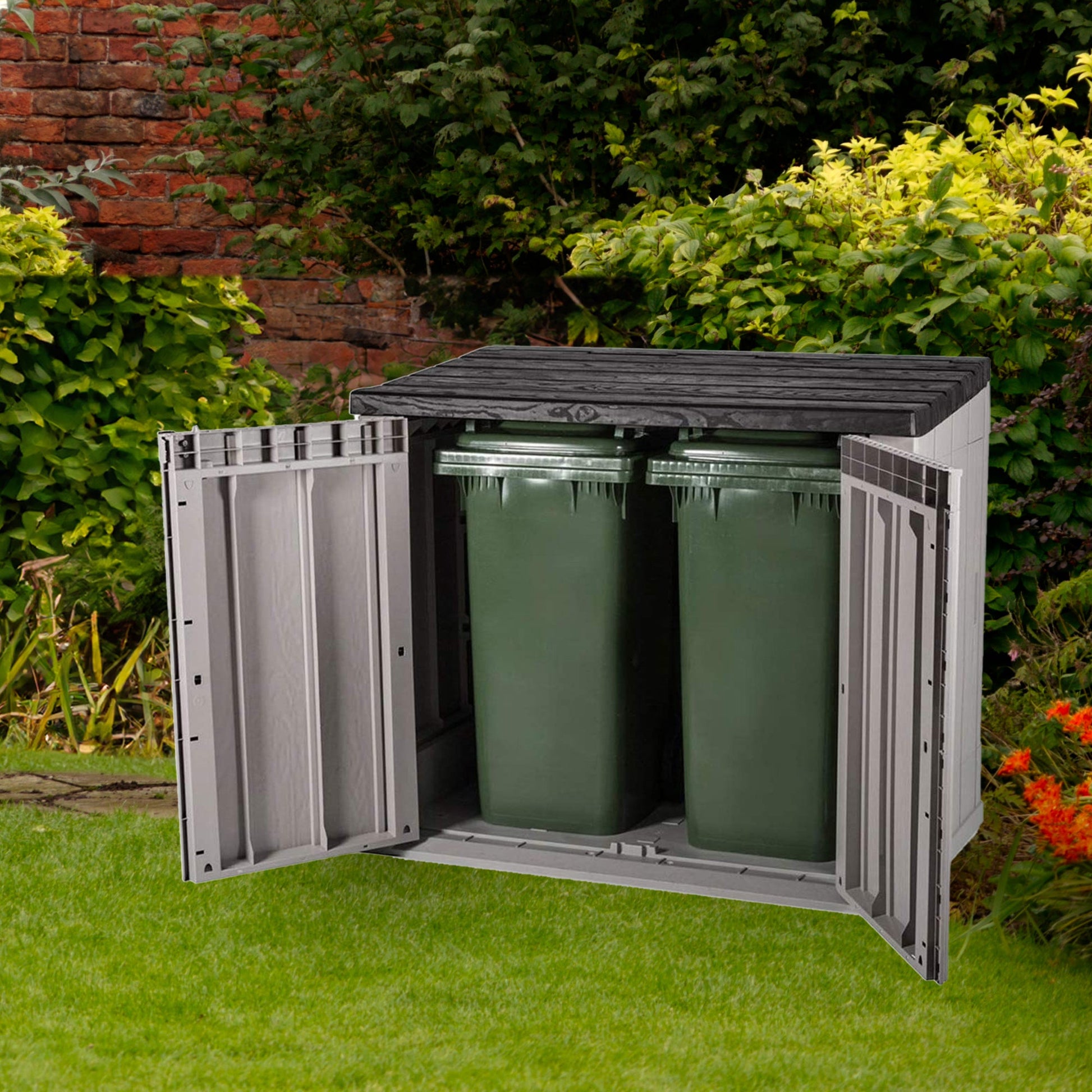 With a spacious inside giving you plenty of space for your outdoor furniture, stackable chairs, garden tools, or BBQ accessories. Alternatively, you can also store 2 trash cans and easily open the bin lid in a smooth motion with the hydraulic piston mechanism. This weather-proof shed protects your garden tools or other equipment no matter the weather.