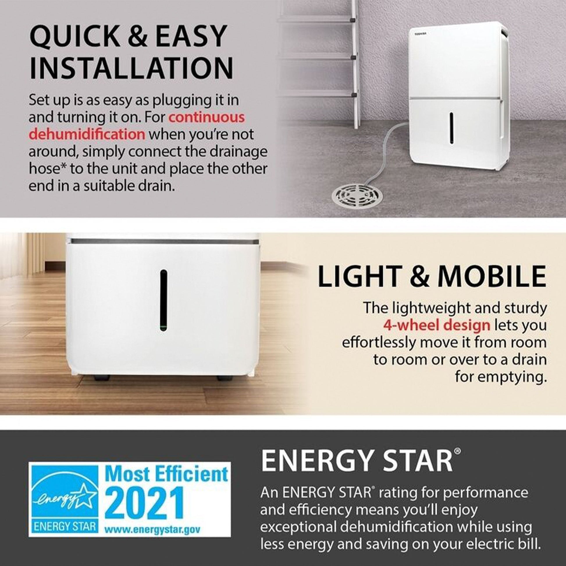 Experience ultimate comfort and peace of mind in your home with the Toshiba 35-Pint dehumidifier, effortlessly removing excess moisture, ensuring energy efficiency, and offering convenient portability for a more enjoyable living environment.