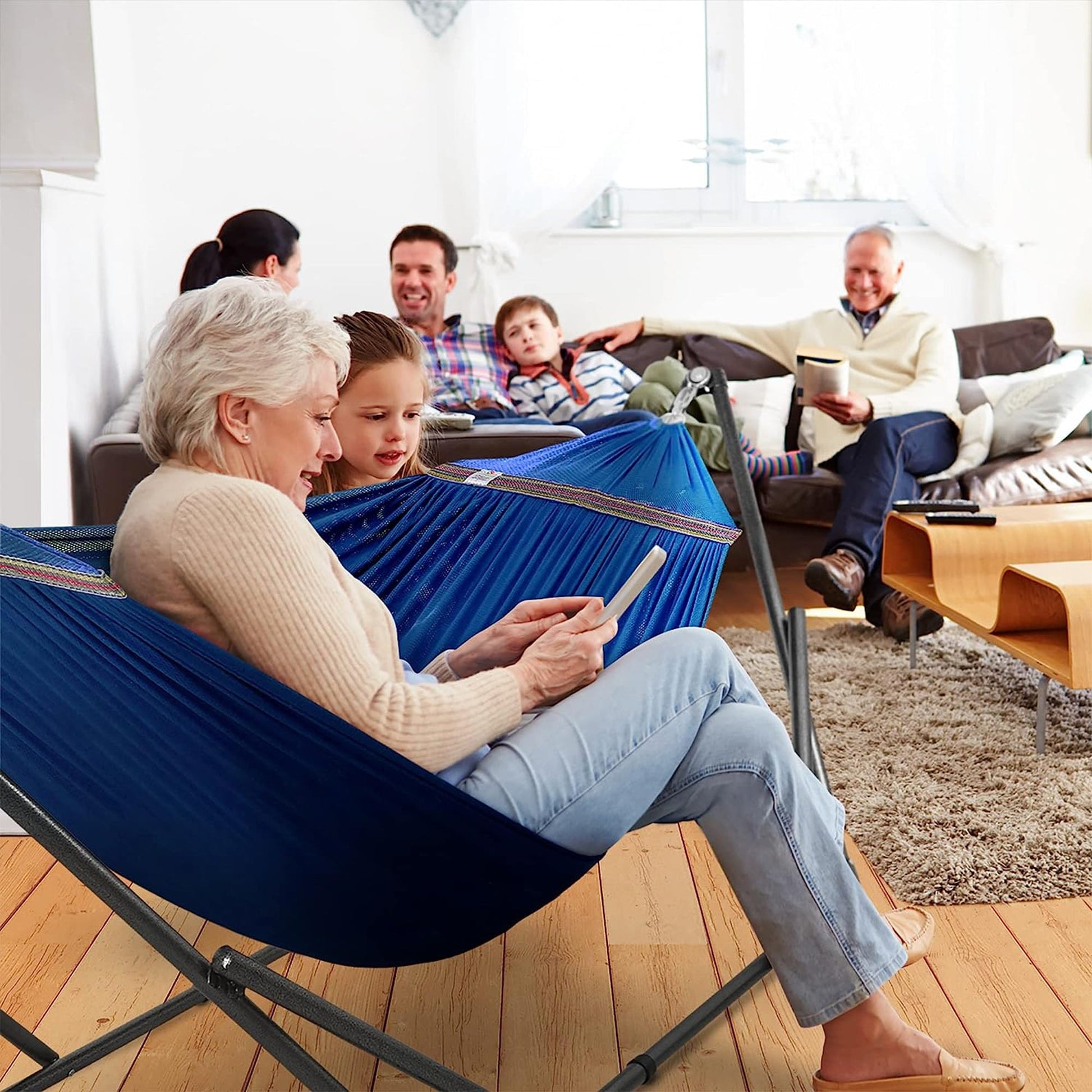 Whether you need a much-deserved nap or a space to immerse in your hobbies, such as reading, this hammock is the ideal spot for maximum relaxation. Crafted of 2-layered breathable polyester materials, 2 people can rest comfortably on the expandable net while the stitched-in spreader bars ensure no uncomfortably cocooning. With the rubber feet stabilizers to minimize scratching, you can set up this resting station anywhere you'd like.