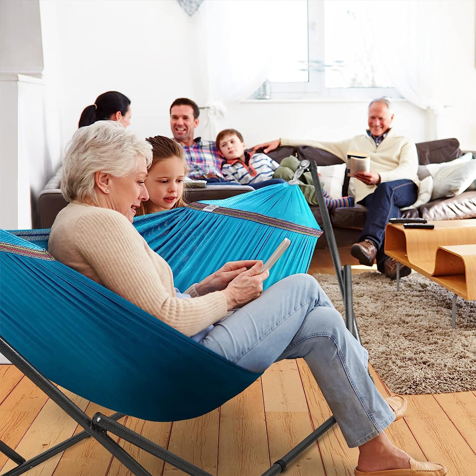 Whether you need a much-deserved nap or a space to immerse in your hobbies, such as reading, this hammock is the ideal spot for maximum relaxation. Crafted of 2-layered breathable polyester materials, 2 people can rest comfortably on the expandable net while the stitched-in spreader bars ensure no uncomfortably cocooning. With the rubber feet stabilizers to minimize scratching, you can set up this resting station anywhere you'd like.