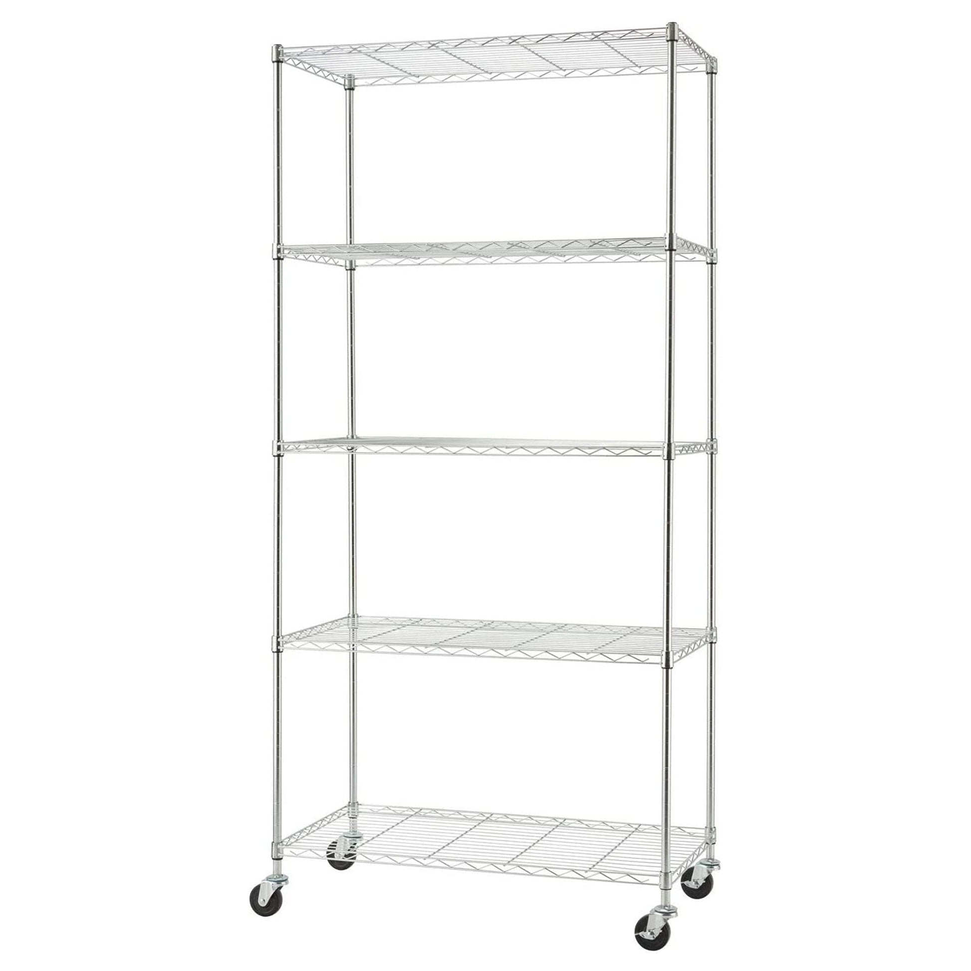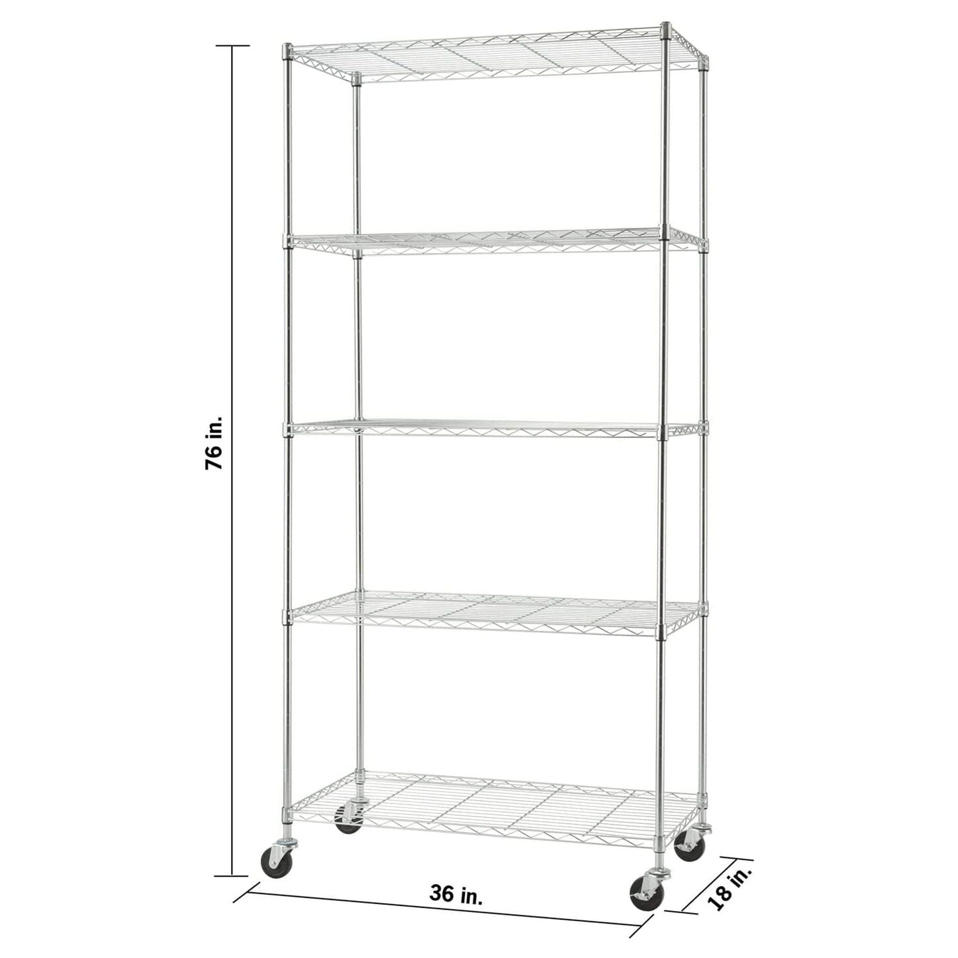 This NSF-certified wire shelving rack with 5 adjustable tiers is a versatile solution for your home storage needs. Customize this unit to your specific needs using either the included feet levelers or wheels. Each heavy-duty tier holds up to 250 pounds on feet levelers and 160 pounds on wheels for the secure storage of heavy, bulky, or oversized items.