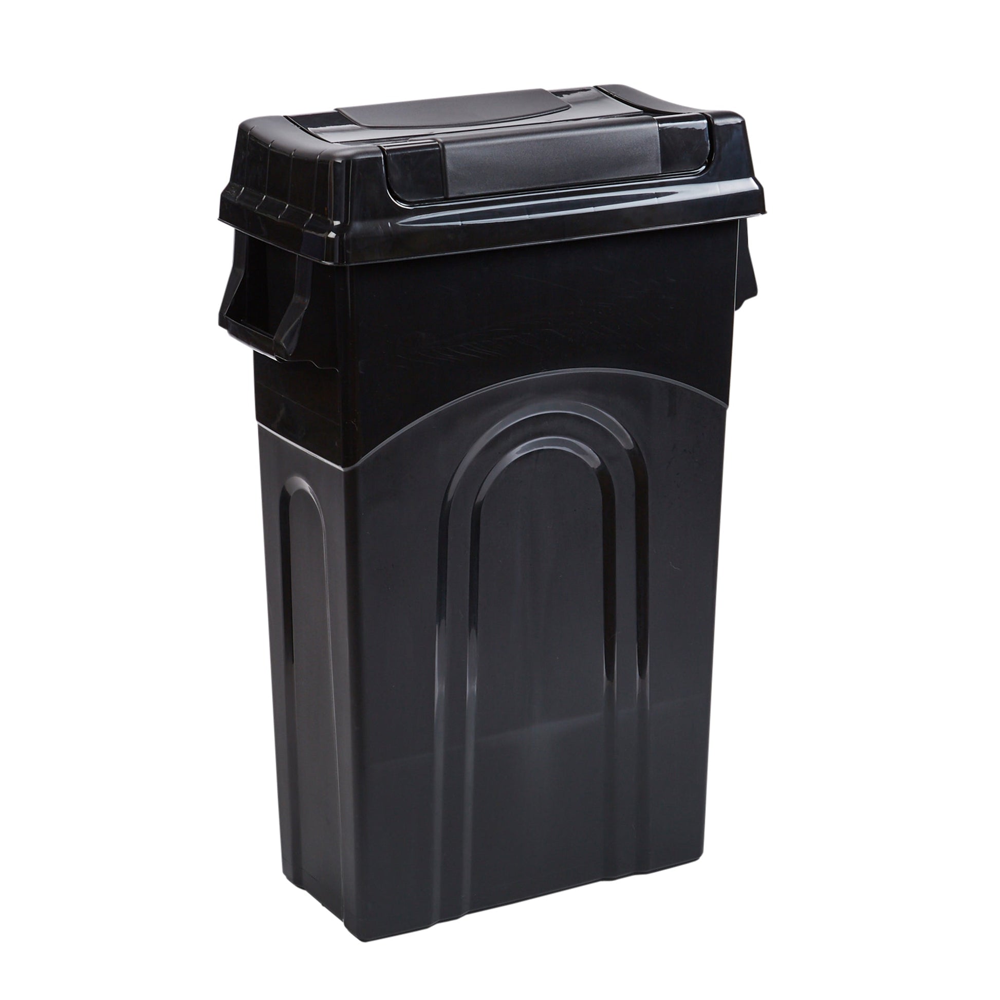 With a simple design, this plastic trash can looks great anywhere in the home and office including bedrooms, bathrooms, home offices, and kitchens. This Highboy bin is excellent for recyclables in any room. Its narrow design and sleek shape, are ideal for the kitchen, garage, office, or other areas where space is limited. The plastic wastebasket holds up to 23 gallons of trash or recycling.