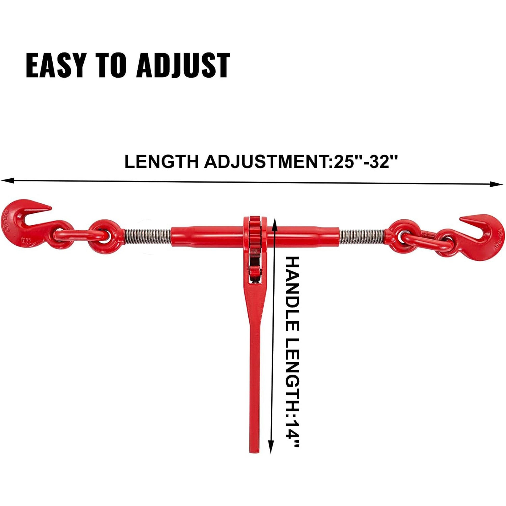 - The ratchet binder features (2) adjustable G70 hooks (25-32 inches) for securing chains of varying lengths with ease, plus an extra shackle for added flexibility