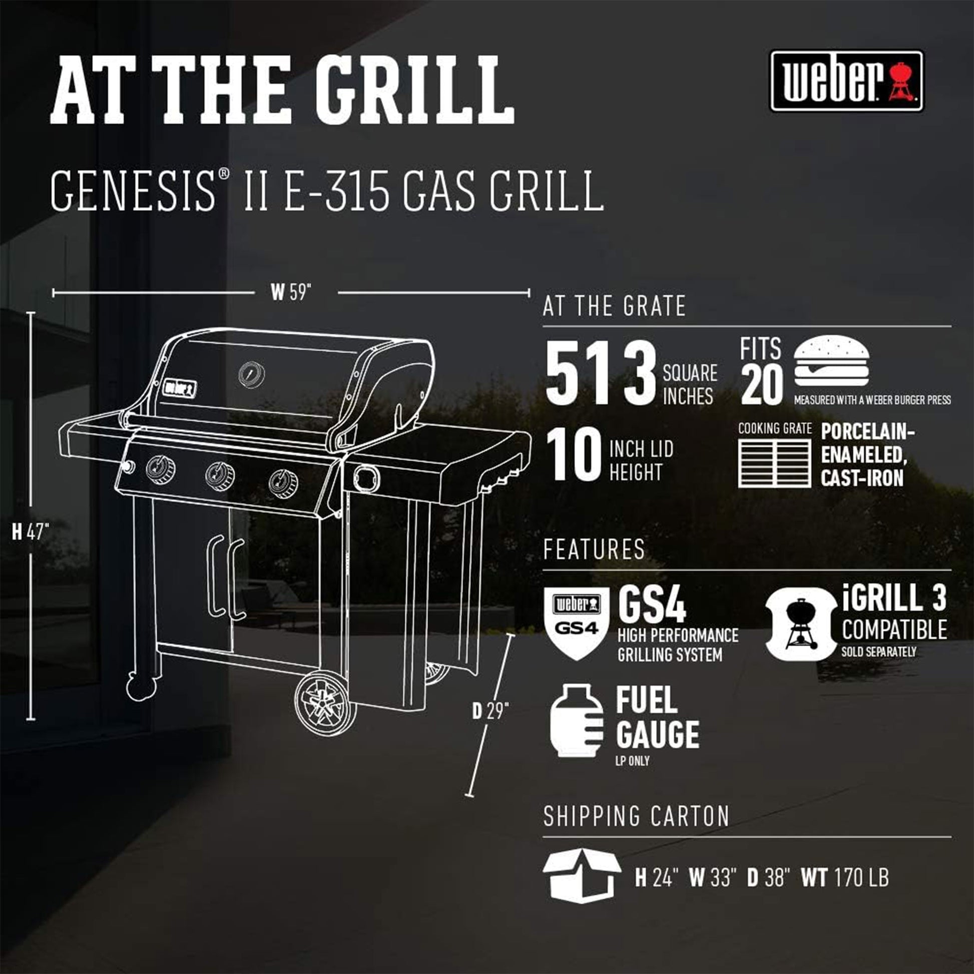 These grates provide unparalleled performance with even heat distribution and superior retention, ensuring a flawlessly seared finish for every dish. Excel in heat distribution and achieve precise temperature control for the excellent grill every time. This Weber grill has a smart design with a porcelain-enameled lid that keeps in heat and protects against the elements. For tech enthusiasts, the iGrill 3 app-connected thermometer (sold separately) lets you monitor your food's temperature in real-time on your mobile device.