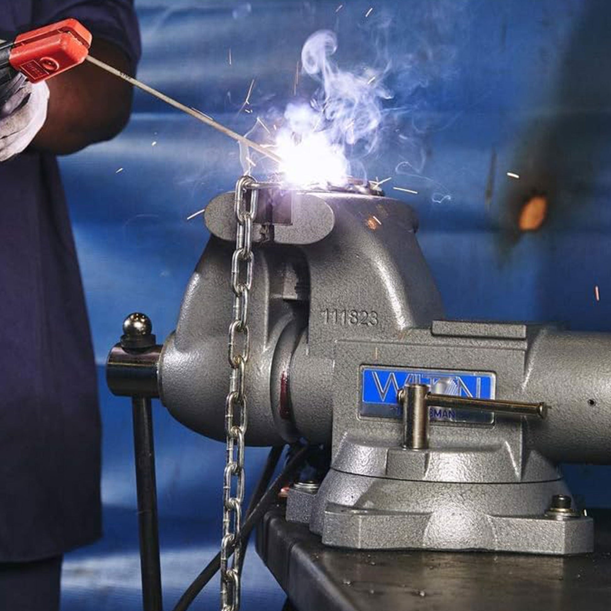 This Wilton bench vise has a 360-degree swivel, jaw width of 6.5 inches, and throat depth of 4 inches. With grooved steel jaw inserts and a solid design, this vise is built to last.