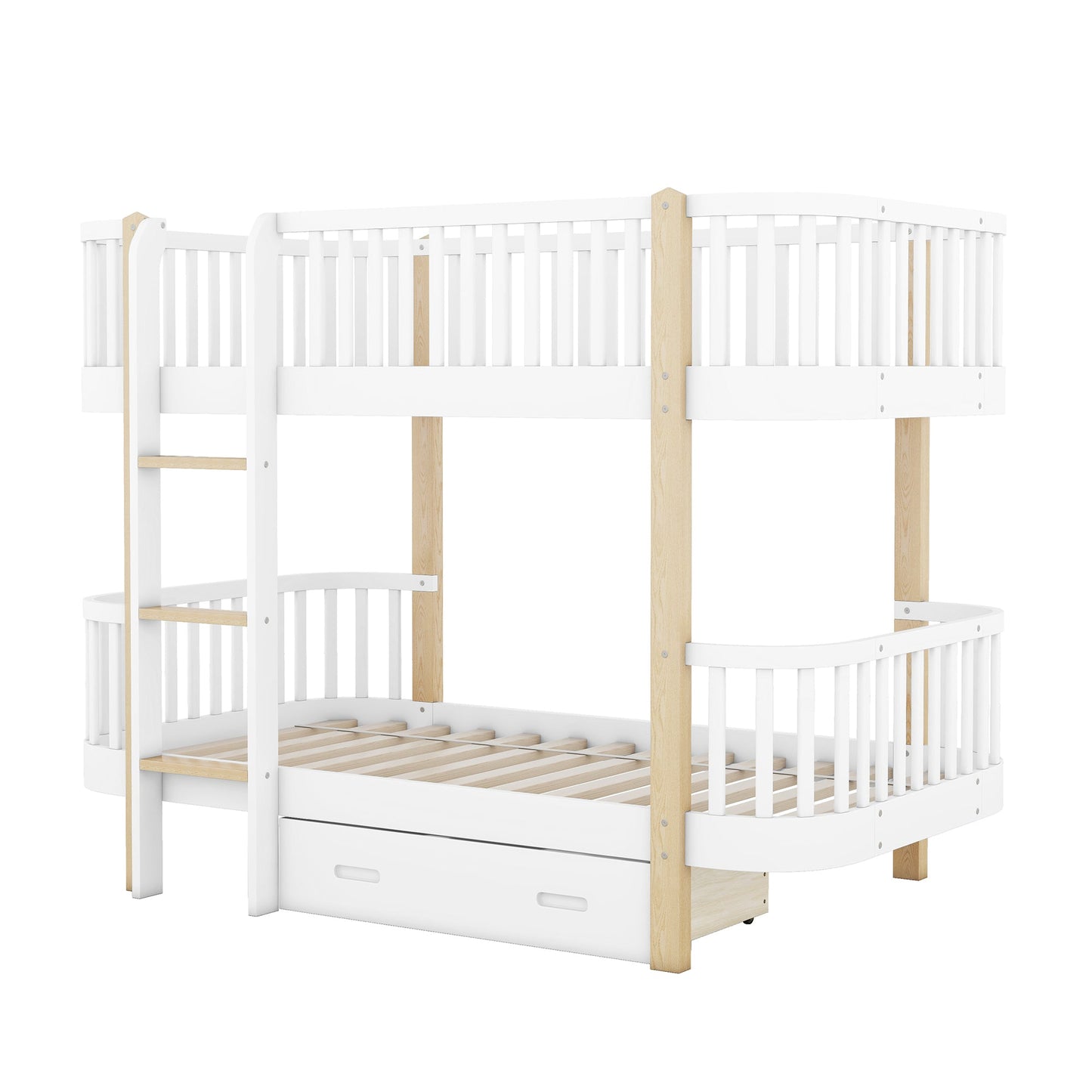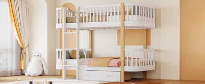 Wood Twin over Twin Bunk Bed with Fence Guardrail and a Big Drawer, White