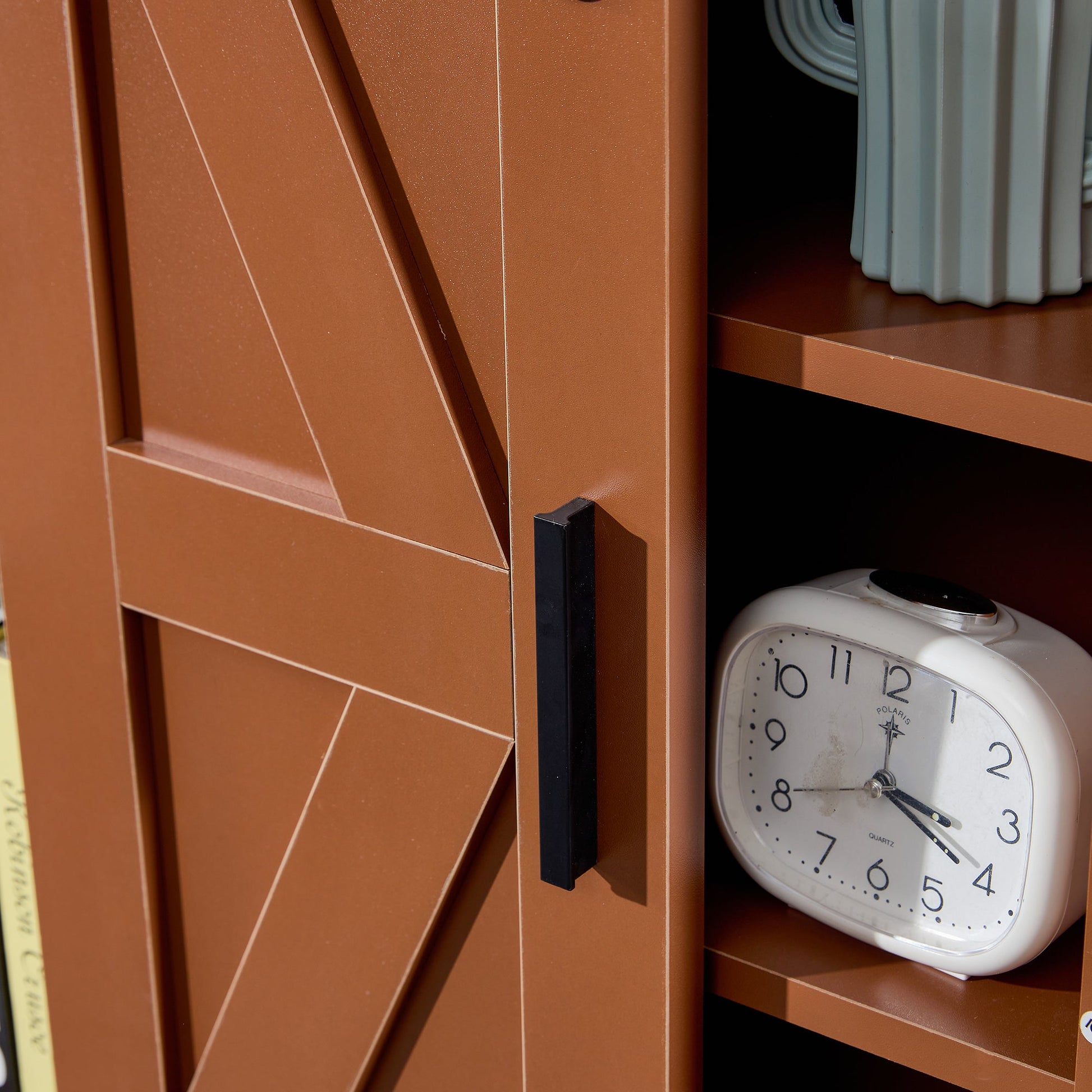 [Elegant Details]- The cabinet is made of MDF and metal, and it is divided into 5 spaces with 3 heights available to store the right amount of items accordingly. The sliding door design does not pinch your hand and reduces damage to the door from opening and closing.