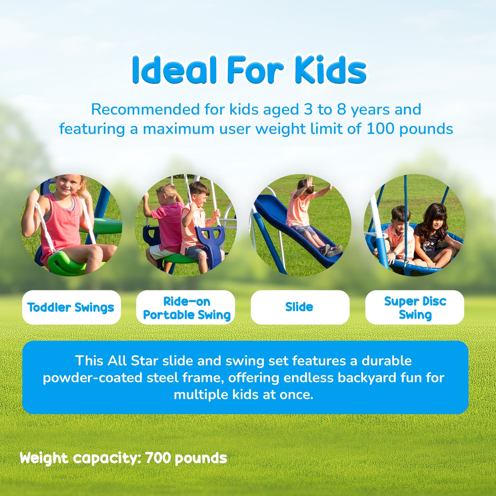 With space for up to 7 kids to play together in this swing and slide set, there's no need to worry about anyone feeling left out. Whether it's swinging, sliding, or soaring through the air on the super disc backyard swing, every child can join in the excitement. This All Star slide and swing set features a durable powder-coated steel frame capable of supporting up to 700 pounds, withstanding enthusiastic play. The high-density foam-padded legs provide a soft landing, while the included slide for backyard has a molded bottom for a secure landing zone.