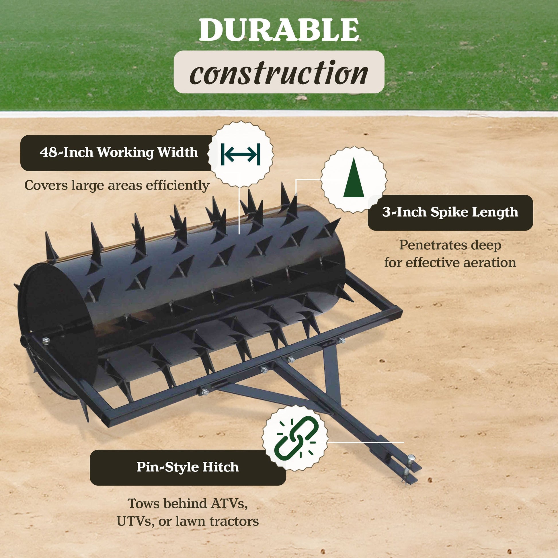 This robust tool features a generous 48-inch working width, making it perfect for easily tackling large areas. Its 108 heavy-duty, 3-inch spikes penetrate up to 2.5 inches into the ground, ensuring deep aeration that allows air, water, and nutrients to reach the roots of your grass. With a substantial 32-gallon capacity, this aerator can be filled to maximize its weight, ensuring it effectively compacts the soil as it aerates, doubling as a lawn roller to maintain a smooth and even surface. Rest assured, your lawn is in good hands with the Yard Tuff Aerator. Built to last, the Yard Tuff Drum Spike Aerator is constructed from heavy-duty steel, guaranteeing durability and reliability. This yard essential is compatible with ATVs, UTVs, or lawn tractors equipped with a pin-style hitch, making it versatile and easy to integrate into your existing gardening equipment. The aerator is especially effective in looser soils with higher sand concentrations, providing excellent results with minimal effort.